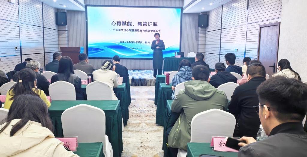 15日上午,培训班学员聆听了南通大学教育科学学院慕君教授的专题讲座《心育赋能 慧管护航——中专班主任心理健康教育与班级管理实务》。慕教授从政策导向与现实问题切入,阐明了班主任开展心理健康教育工作的必要性与目标方向,并结合大量鲜活案例,提供了具体可操作的“心育”与“慧管”实践策略,为学员今后的班级管理工作提供了扎实的方法指导。