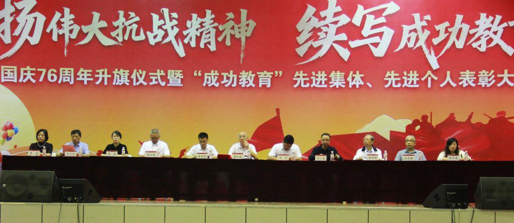 9月30日上午,我校在学校体育馆举行以“弘扬伟大抗战精神,续写成功教育华章”为主题的国庆76周年升旗仪式暨第十四届“成功教育”先进集体、先进个人表彰大会。校领导班子成员、校关工委领导、家长代表及全校师生参加这一盛大活动。