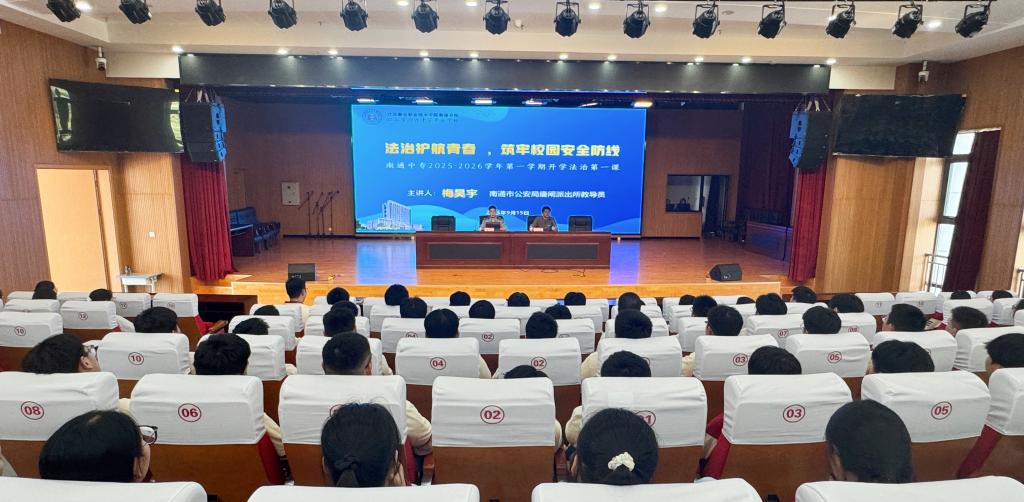 9月15日,南通中专法治副校长、南通市公安局唐闸派出所所长沈星星委托该所教导员梅昊宇警官来校,为全体师生带来了一场以“法治护航青春,筑牢校园安全防线”为主题的开学法治第一课。讲座由学工处副处长沈国强主持。